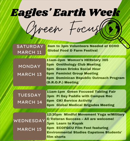 Eagles’ Earth Week - Green FocusEagles’ Earth Week will be occurring after Spring Break from Saturday March 11th – Sunday March 19th (Okay, yes we know, that's slightly more than a week!)