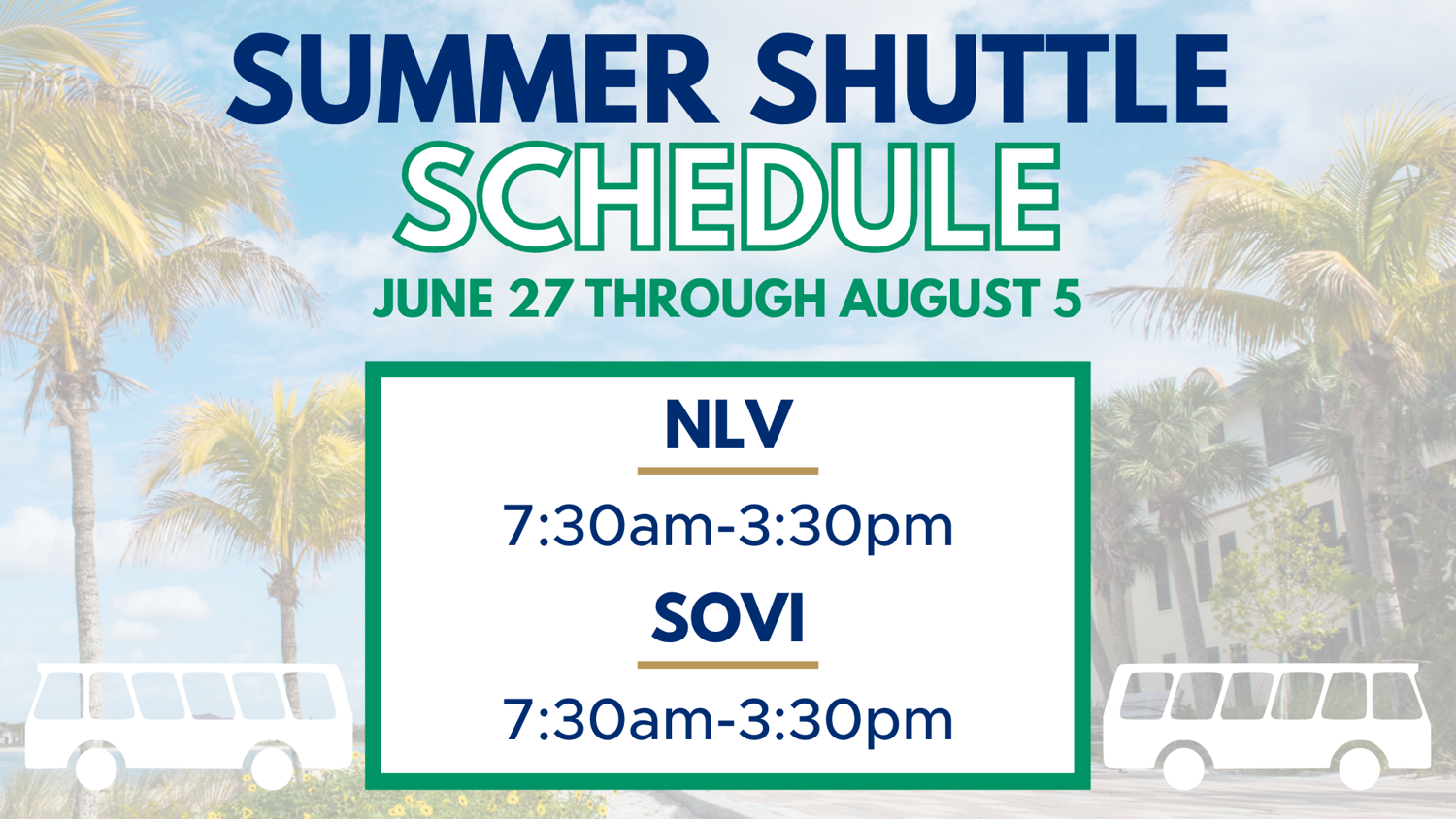 NEW! ๐ SUMMER SHUTTLE SERVICE!Summer Shuttles are now running on campus from NLV and SOVI weekdays from 7:30am-3:30pm