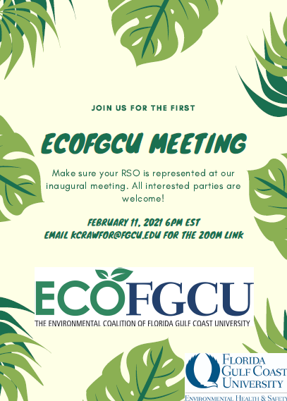 Join us for the first ECOFGCU Meeting THURSDAY 2/11 at 6pmWe are restarting ECOFGCU as a registered student organization to bring all sustainability and/or service clubs together for a chance to interact through Zoom and in-person meetings.We are having our first meeting over Zoom on Thursday February 11