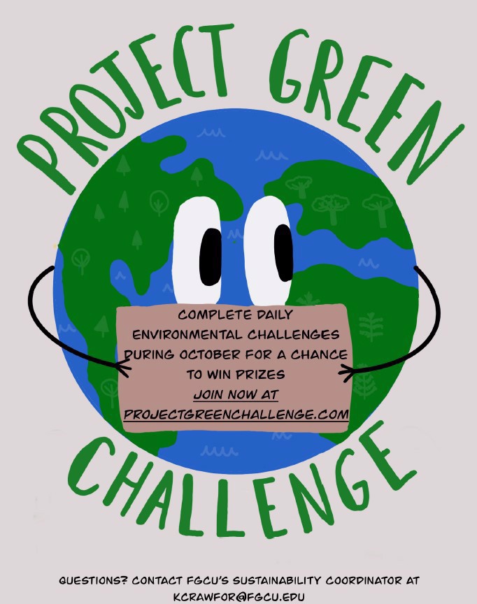 SAVE THE DATE… or 30! FGCU Project Green Challenge 2021Project Green Challenge kicks off this Friday, October 1 — the first of thirty days of activism on climate action, public health and sustainability for students around the world. Sign up today at projectgreenchallenge.com
